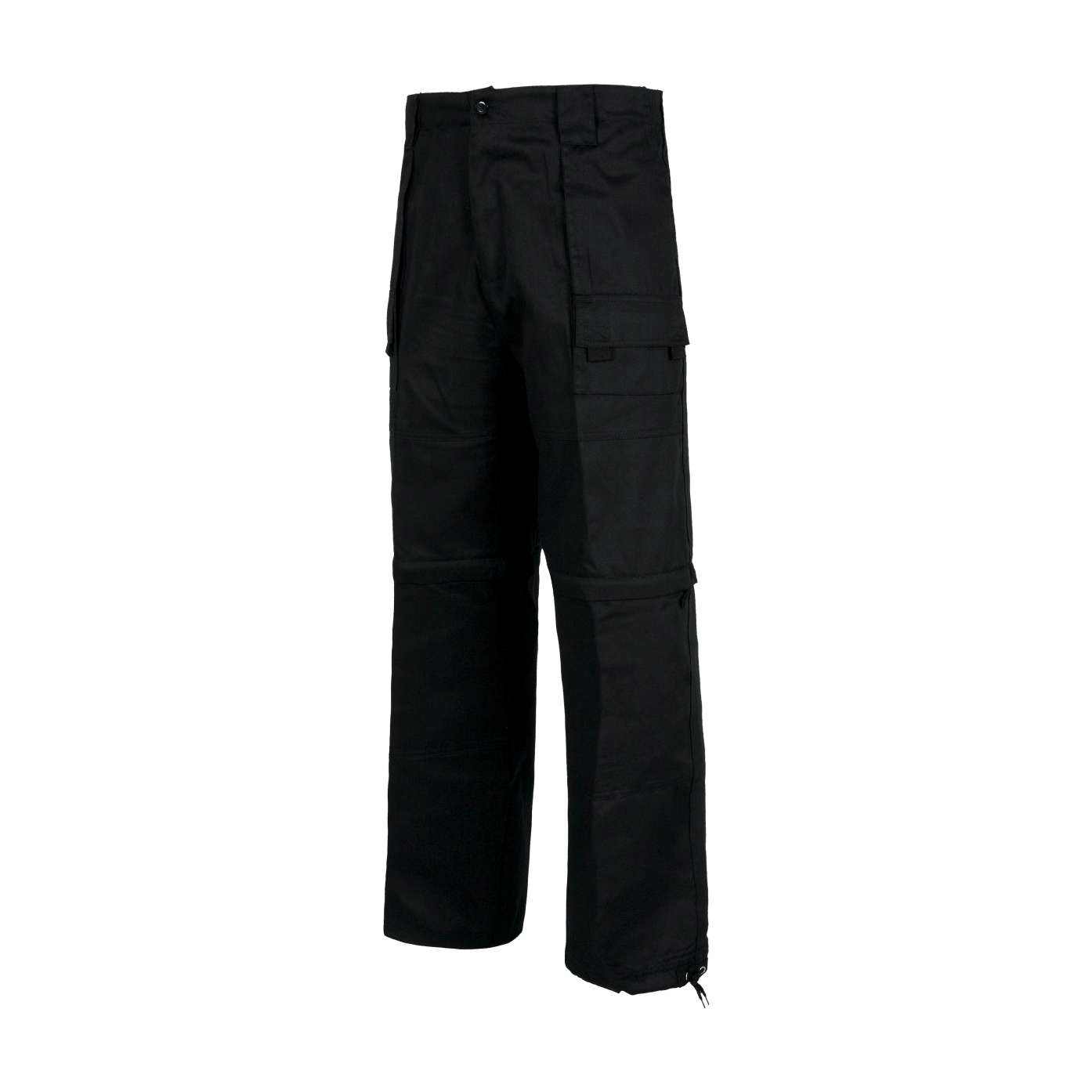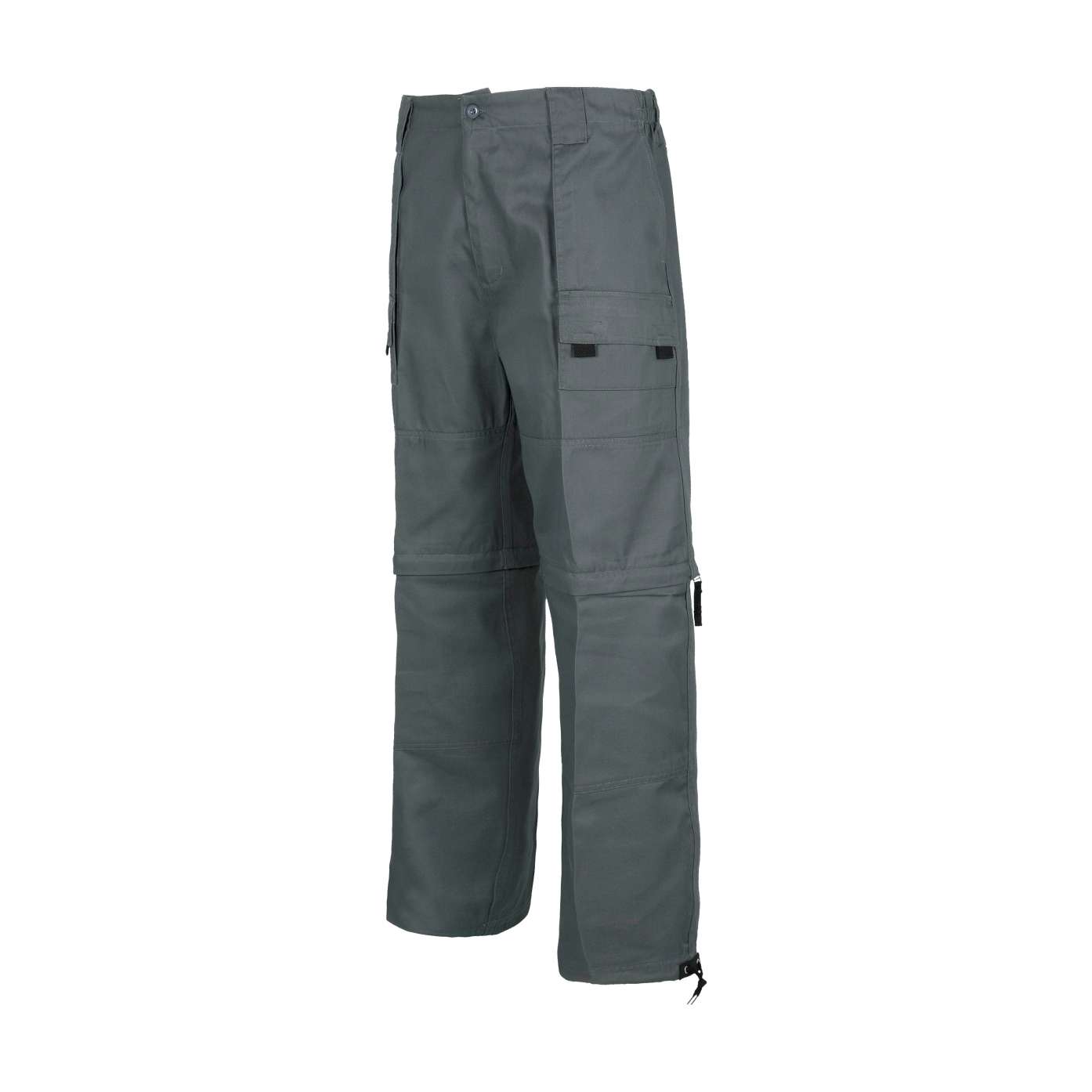Calça desmontável com dois bolsos de fole nos costados e bolsos auxiliares sobrepostas com lapela de velcro. Dois bolsos de chapa traseiros com lapela de velcro. Ganchos nas lapelas. Fecho de correr de náilon nas perneiras. Cordão ajustável em baixos. Elástico nos laterais da cintura. Passadores grandes. Fecho de botão e braguilha de fecho de correr.