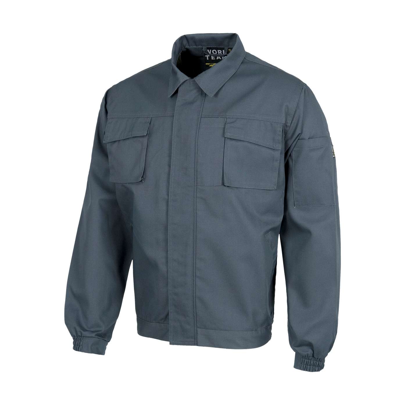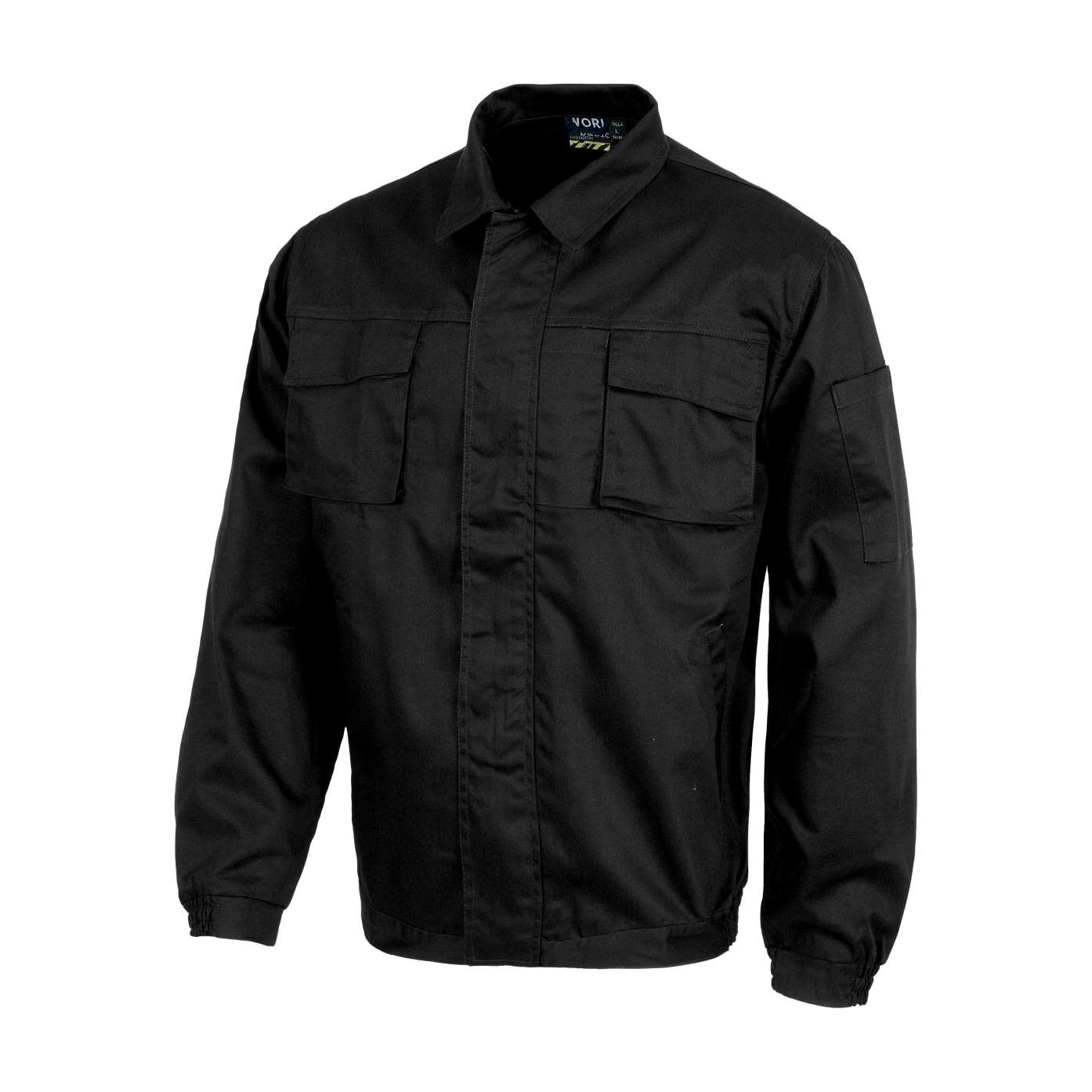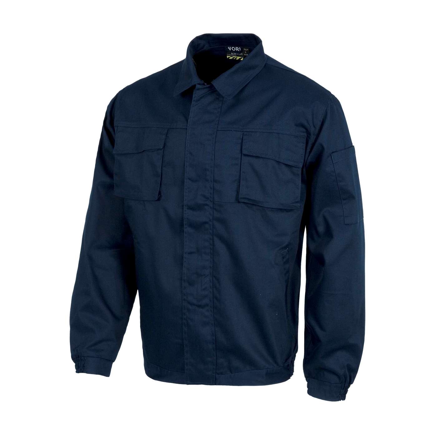 Blusão tripla costura com corpete. Gola tipo camiseiro. Fecho de correr de náilon oculto por aba postiza com velcro. Dois bolsos no peito de fole com lapela de velcro e bolso auxiliar. Dois bolsos laterais semi-inserido. Um bolso na manga com fecho de velcro. Punho com elástico. Foles nas costas. Fecho de velcro na cintura e elástico nos laterais.