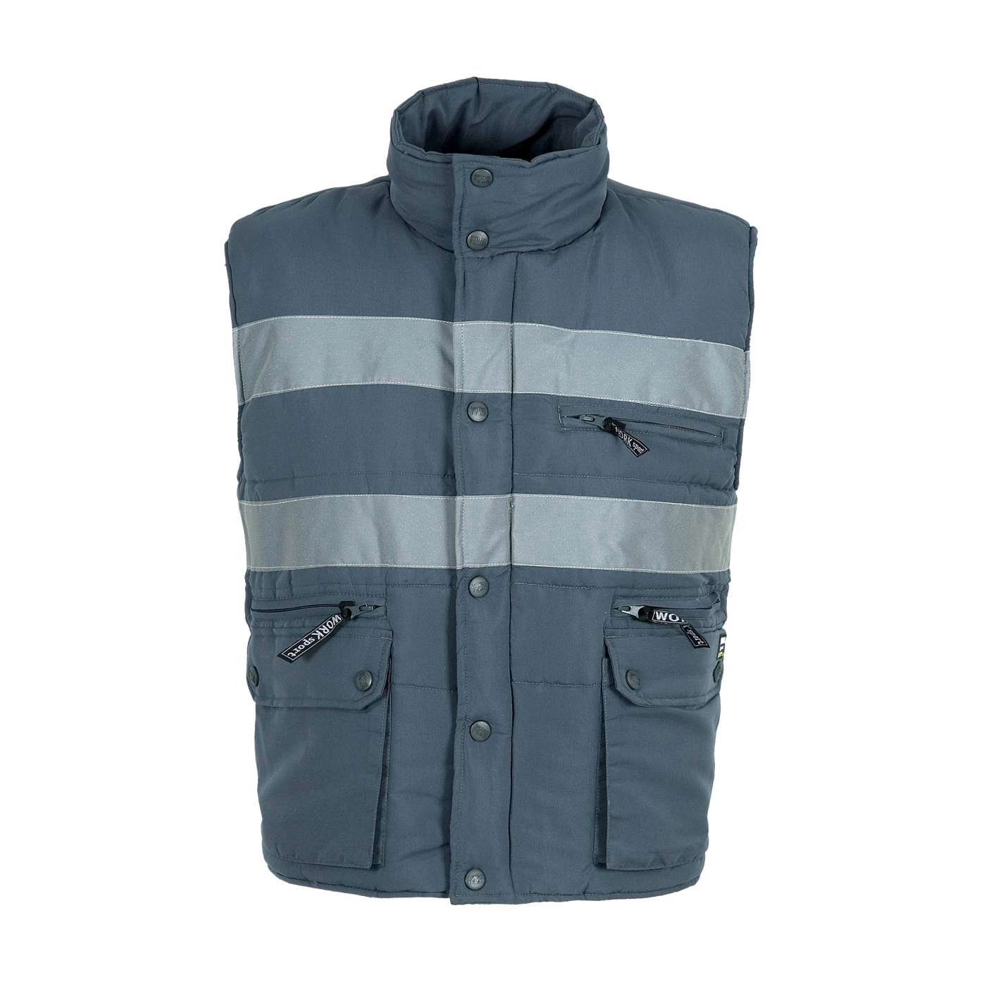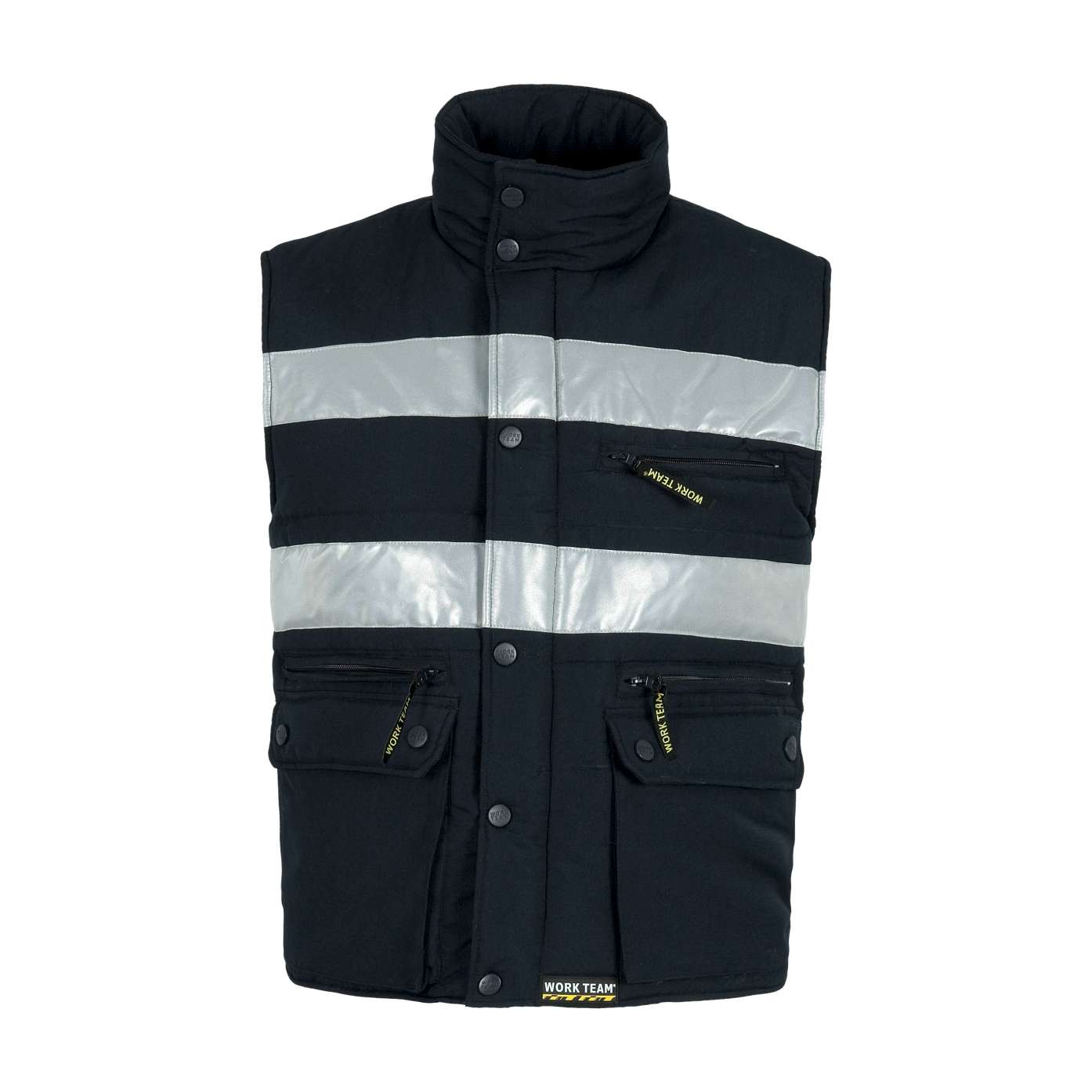 Colete tipo safari com fitas refletoras. Decote em bico e fecho de correr de náilon. Três bolsos no peito de diferente tamanho com fole e lapela de velcro. Argola metálica no bolso superior. Dois bolsos laterais com fole e fecho de correr nos costados. Bolsos auxiliares sobrepostos com lapela de velcro. Bolso traseiro com fole e fecho de correr. Duas fitas refletoras no peito e nas costas. Bainhas.