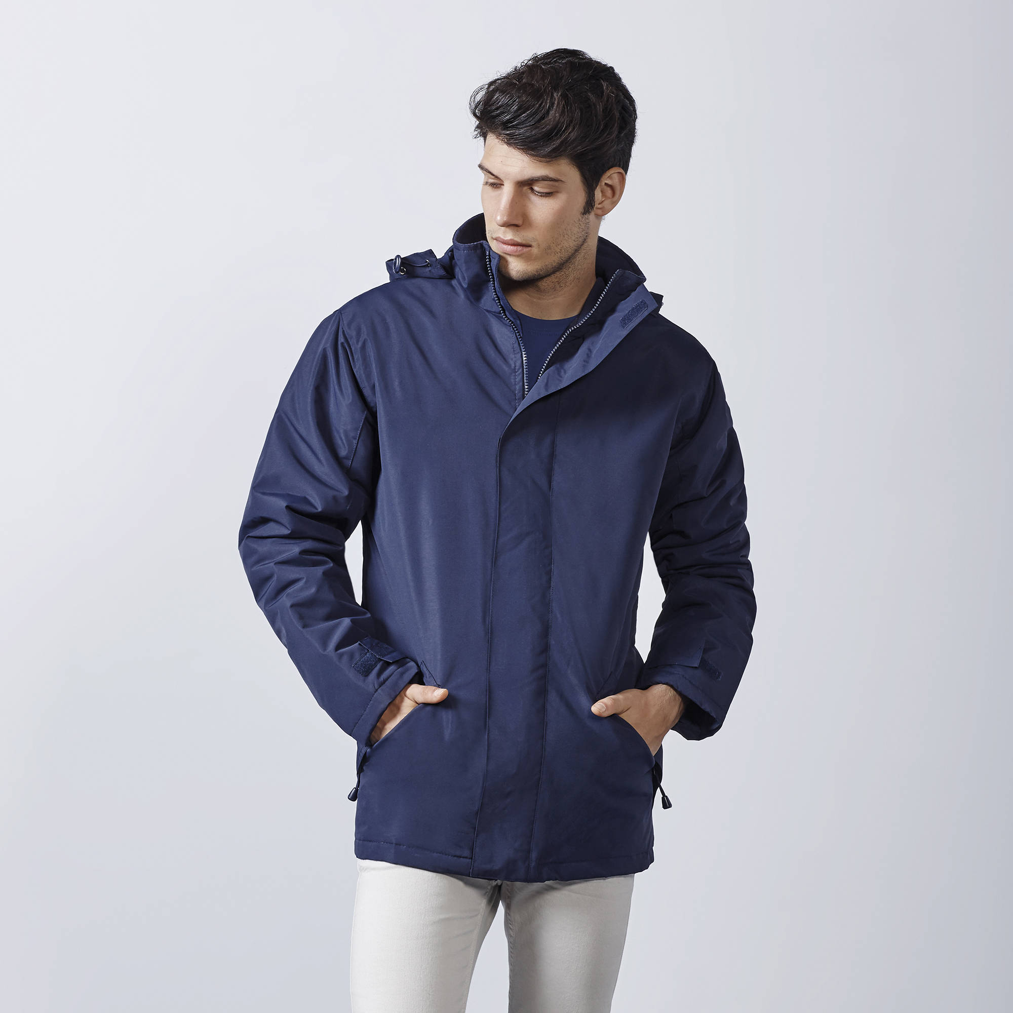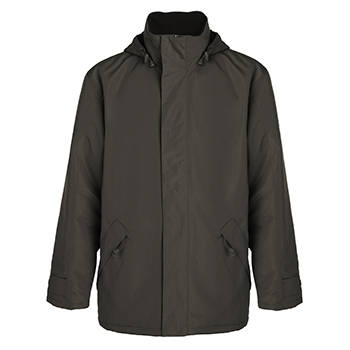 Parka de gola alta com fecho injetado no tom.1.- Capuz dobrado dentro da gola e estraível na gola com fecho de velcro.2.- Bolsos exteriores com fecho, lapela e puxadores.3.- Dois bolsos interiores com velcro.4.- Punhos ajustaveis com cinchas com velcro.