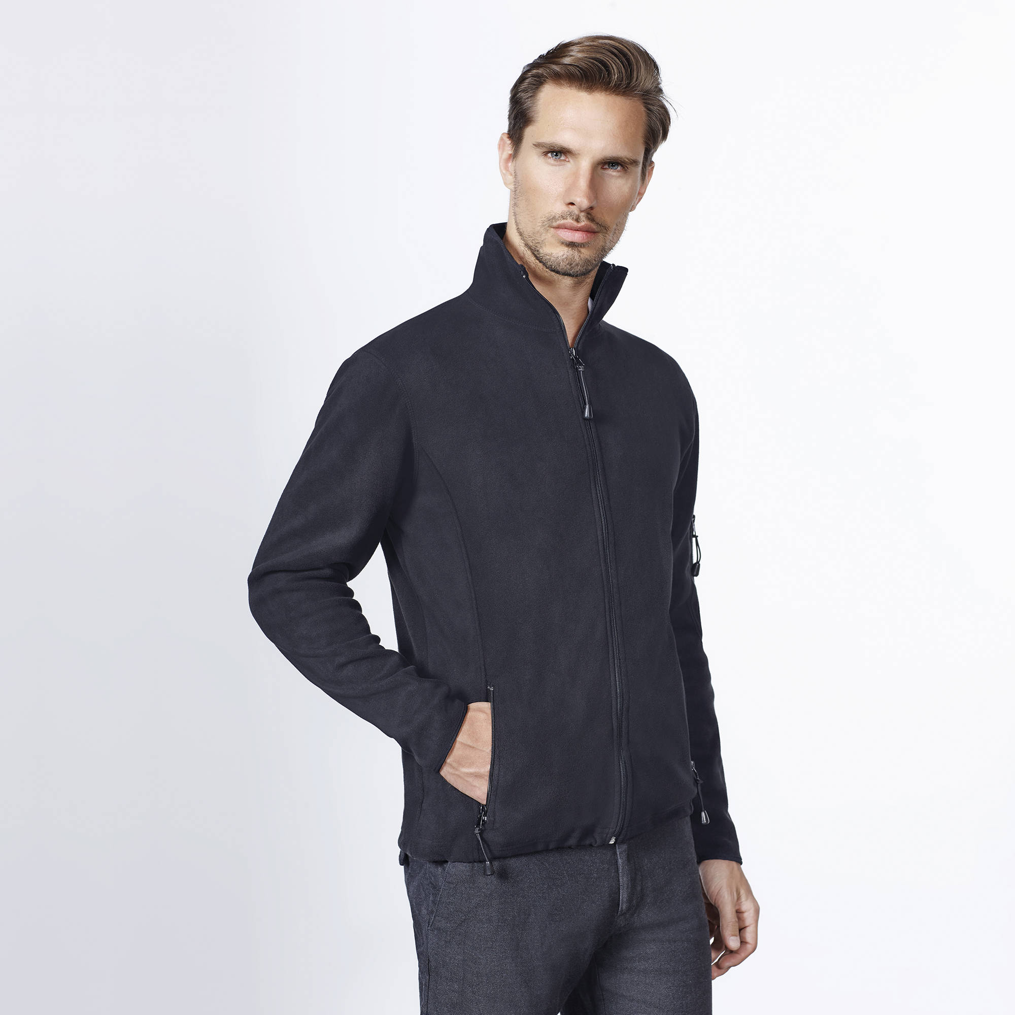 Casaco polar para o esporte ao ar livre, com gola alta e manga comprida com debruns a contrastar. Bolso com fecho na manga esquerda e fecho central, ambos em contraste. Costuras nas partes laterais e nas costas. Cotoveleira no mesmo tecido.